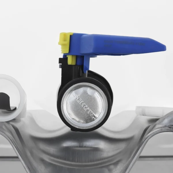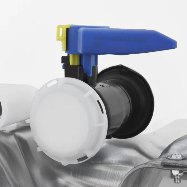 El sistema de conexiones ha sido concebido para agilizar y asegurar cada operación. La apertura superior cuenta con una boca de rosca exterior DN150, compatible con tapa rosca con o sin sistema de venteo, facilitando el llenado controlado y la gestión de presiones internas. La salida inferior integra una válvula mariposa DN50 (2″) con acoplamiento Camlock, que permite realizar conexiones rápidas y herméticas con mangueras y equipos de trasvasije sin necesidad de herramientas, garantizando una descarga ágil, limpia y sin derrames. La válvula viene sellada de fábrica con lámina de aluminio, incluye manilla bloqueada con pestillo de seguridad y tapa protectora, preservando la integridad del contenido durante toda la cadena de transporte.