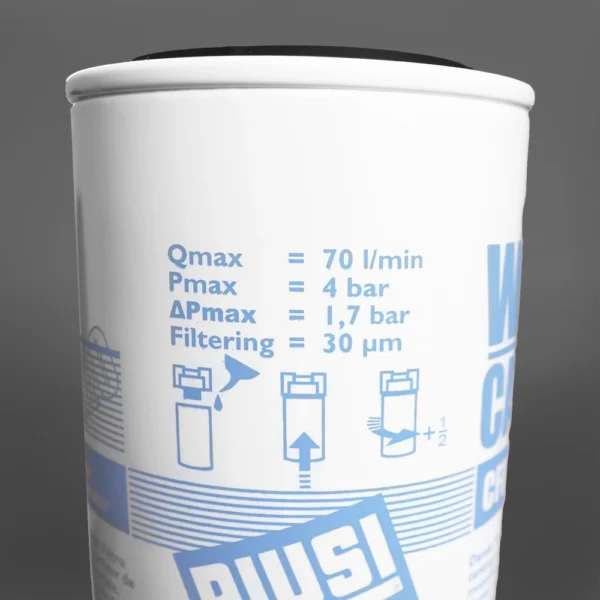 Con una capacidad de filtración de 30 micras y un caudal de hasta 70 litros por minuto, este filtro asegura un flujo constante de combustible limpio y libre de impurezas. A medida que absorbe el agua, el cartucho reduce progresivamente su capacidad de filtrado, por lo que se recomienda reemplazarlo cuando se detecte obstrucción o pérdida de caudal.