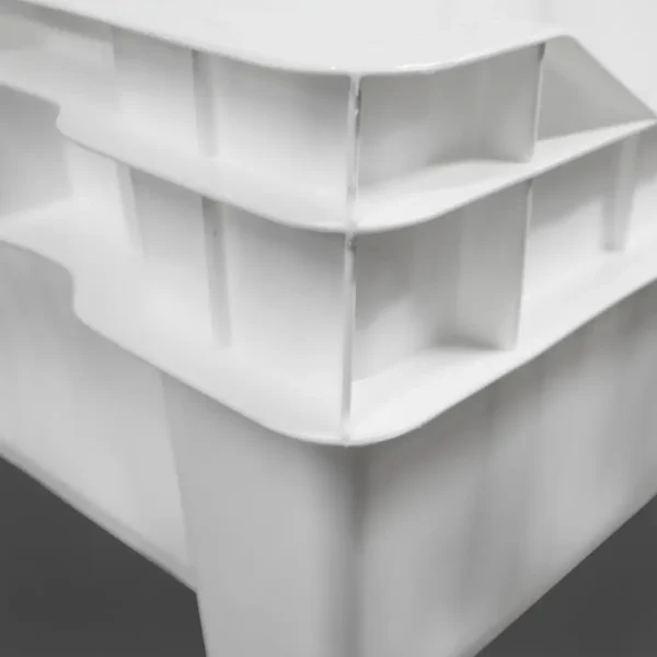 Esta caja soporta una carga útil de 15 kg y una carga de apilamiento de hasta 100 kg, garantizando resistencia y funcionalidad en operaciones exigentes. Su color blanco facilita la identificación y manejo en diversas aplicaciones industriales.
